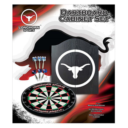 The Longhorn Cabinet Set includes a black wooden dartboard cabinet embellished with the eye catching Longhorn Sports logo.