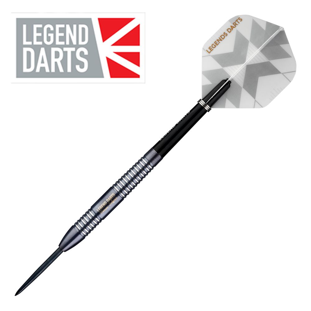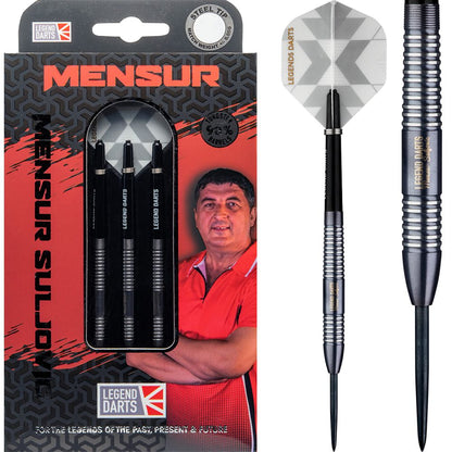 The Mensur Suljovic 90% Tungsten darts are inspired the player himself. The barrel is a straight barrel with black titanium coating with remachined radial grooves along the barrel length. They come with a black Legend Darts shaft, and a set of Mensur 100 Micron Pro Series flights (Std, No.2).