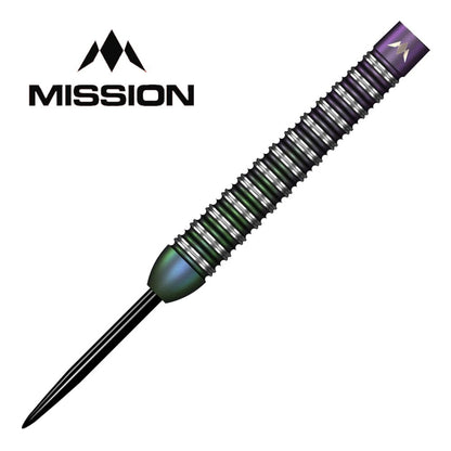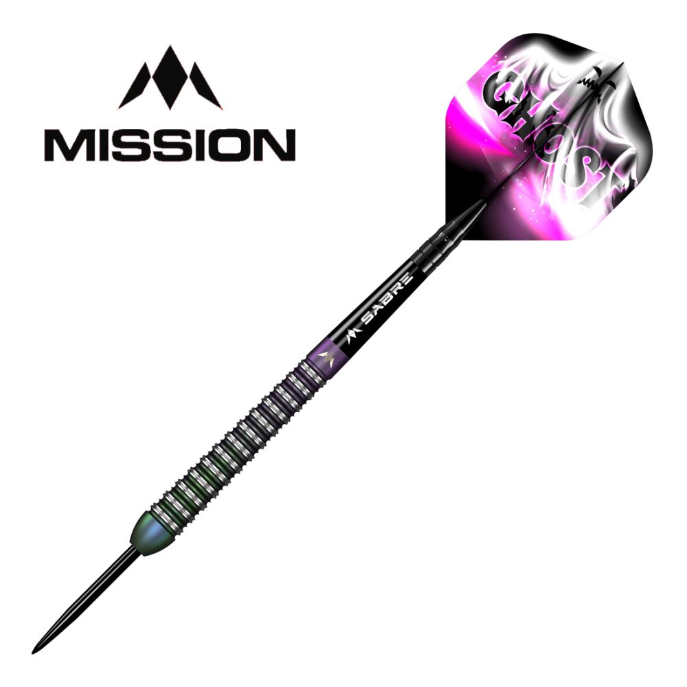 The barrel leads to a Mission Sabre shaft in black which keeps the flight in place. The dart is complete with a black point and the Mission logo is laser-etched into the rear of the barrel.