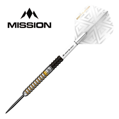 The Mission Brett Claydon players' darts feature a straight barrel design and bull nose, coated with Black & Gold PVD coating. The full length of the barrel has a mixture of Radial grooves.
