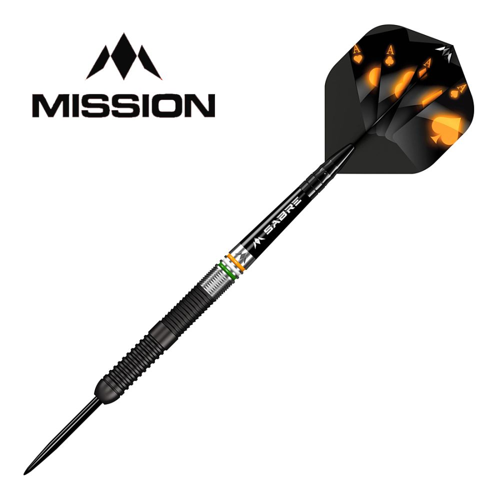 The barrel leads to a Mission Sabre shaft in black which keeps the flight firmly in place. The dart is complete with a black point and the Mission logo is laser-etched into the rear of the barrel.
