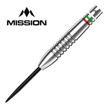 The Mission Rhian O Sullivan dart is a bomb design incorporating a large radius nose with a simple ringed central region. The rear taper of the barrel has red, green and white painted grooves to symbolise the Welsh flag and then Mission logo is laser-etched into it.