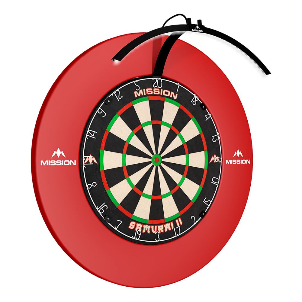 The Mission Torus 100 LED Folding Dartboard Light is constructed from lightweight aerospace grade aluminium, making it very light and strong. The Torus light fits all dartboards via its unique Spring Clip system which clamps securely to the outside of the board. The Ultra white light LEDs ensure a bright light on the dartboard.The Torus 100 is designed for Travel in mind, The light has the 25 degree angle on inner lip, allowing extra light to flood the surface of the dartboard.The Torus 100 light Can be used with or without a surround and is mains powered via a 12V UK & EU Adaptor