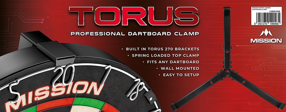 Change or rotate your board in seconds with this robust Spring-Loaded Wall Mounted Dartboard Clamp with built in Torus 270 and Torus 100 light Fittings. The Mission Torus Dartboard Clamp mounts directly to your wall. The top arm is spring-loaded to grip the dartboard firmly. Simply push up to remove, add or rotate your dartboard in seconds; there is no need to screw anything into the back of the dartboard!