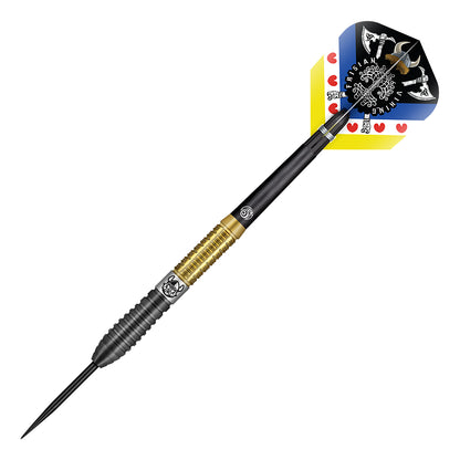 Jitse van der Wal's stunning two-tone titanium Pro Series dart set is a highly engineered offering that balances terrific looks and performance. The nose with fine shark cuts to reduce deflections is a smart design choice, especially for tighter groupings. The progressive traction on the ring grip towards the push point caters well to players who prefer a dynamic grip transition. Corrugated rings with long mill cuts at the tail provide a consistent yet non-sticky feel, which is excellent for controlled releases.