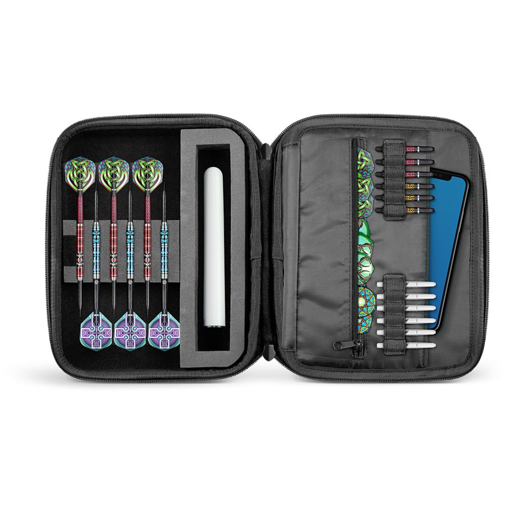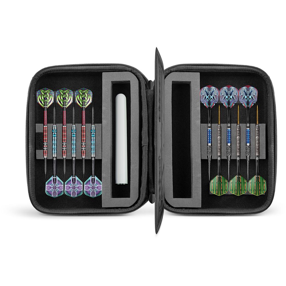The tough supersized 23x18 cm Mega Tactical Dart Case carries and protects four sets of fully assembled darts without crushing flights, ready for play. But that s just the start. A quality zip closure opens the case like a clamshell. The dual-sided inner sleeve with multiple storage compartments provides generous storage for flights, shafts, and accessories. Use the full-depth zipped pocket for secure phone storage on one side; a large pocket on the other is useful for personal items like cards and keys. The portable Mega Tactical case has a quality nylon handle and metal d ring for clipping on extras-whatever you need for the competition.