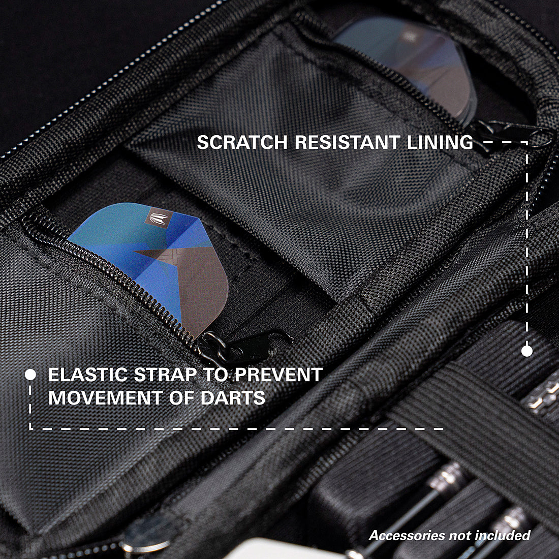 The wallet boasts efficient organization with two zip-locked pouch pockets, offering dedicated space for spare dart accessories such as flights, shafts, points, or a Swiss Point tool, making them easily accessible during intense games.