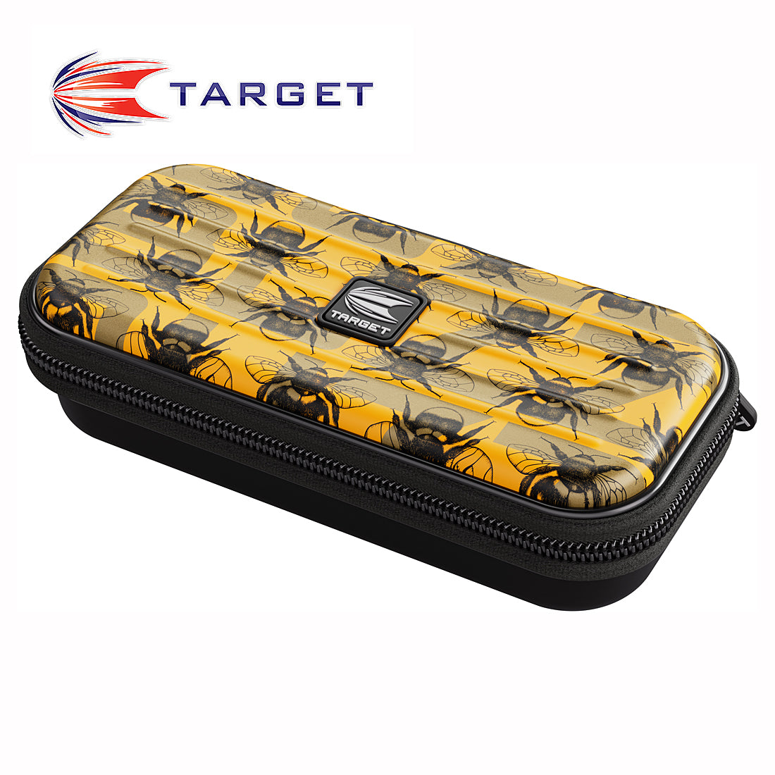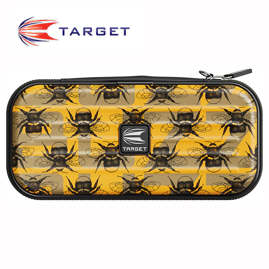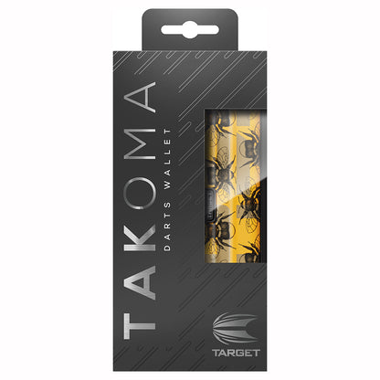The Buzz Takoma Wallet is an eye-catching and durable dart wallet, designed as part of the Ento range, inspired by the intricate beauty of bees, featuring a bold, honey-yellow backdrop adorned with a vibrant bee-themed pattern.
